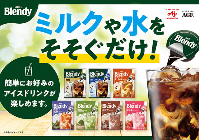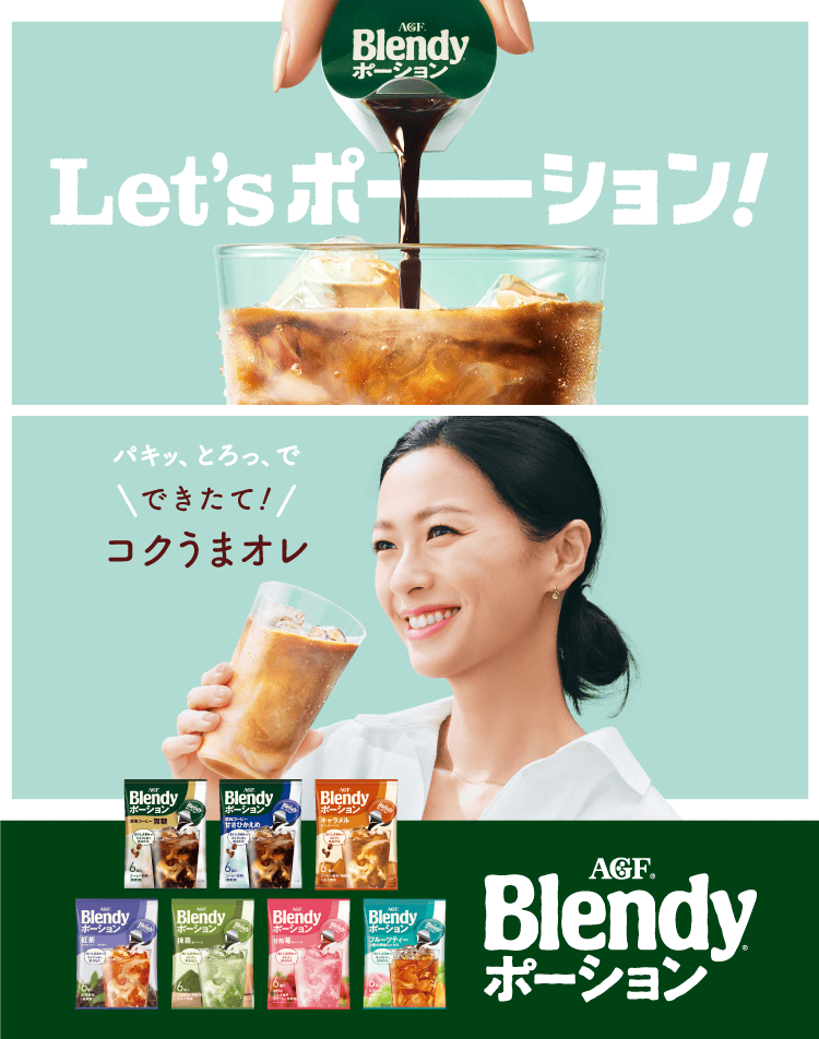 AGF Blendy Potion is a concentrated liquid beverage that lets you easily enjoy the cafe atmosphere by simply adding it to water or milk. One portion makes iced cafe au lait or iced coffee in no time. It's perfect for making cool drinks in the summer.