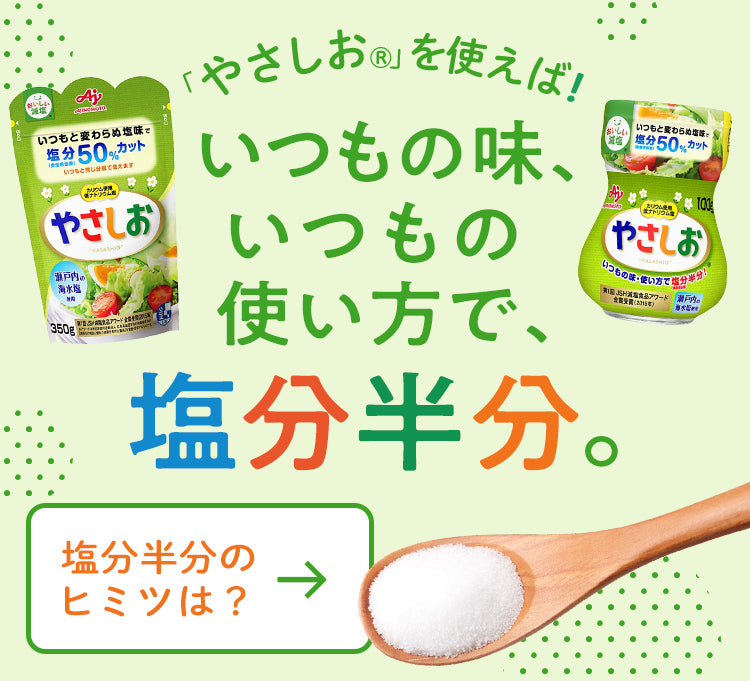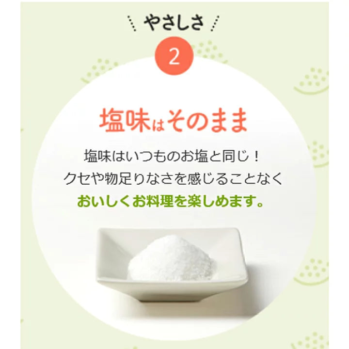 Yasashio contains 50% less sodium (salt equivalent) compared to regular salt, while keeping the same savory flavor.