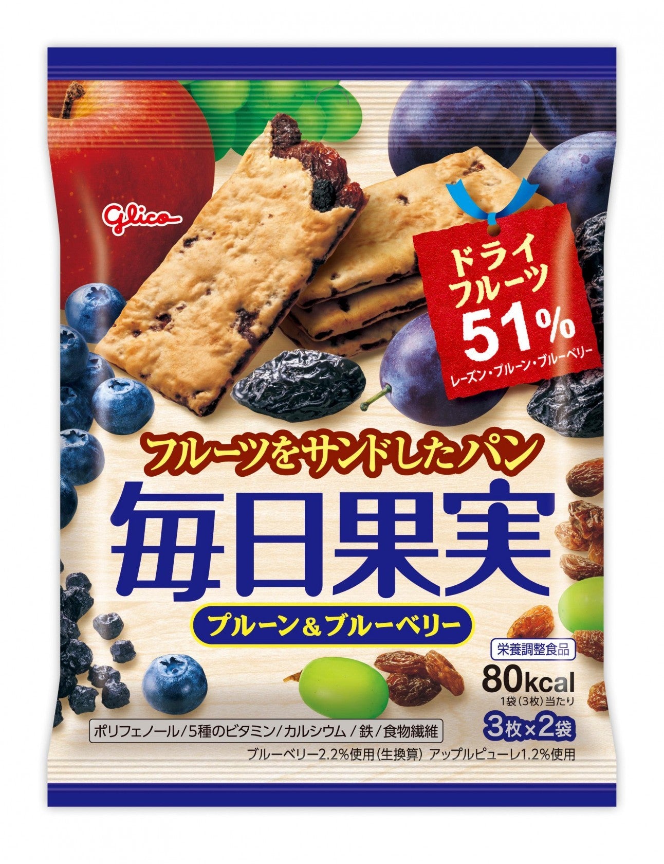 Ezaki Glico Mainichi Kajitsu is a wholesome fruit biscuit made with plenty of dried fruits such as raisins, prunes, and blueberries, sandwiched in a soft baked dough. Each pack (3 pieces) provides polyphenols, dietary fiber, 5 types of vitamins, calcium, and iron—about one-sixth of the daily requirement. A nutritious and satisfying snack that combines great taste with health benefits.