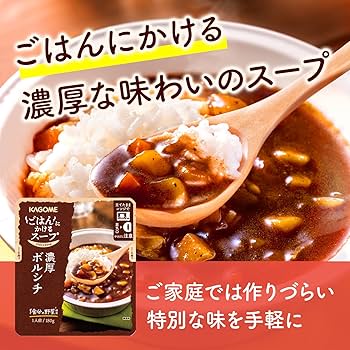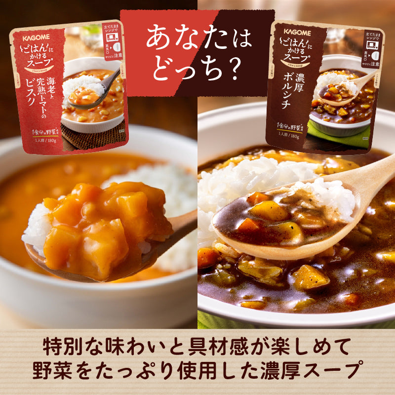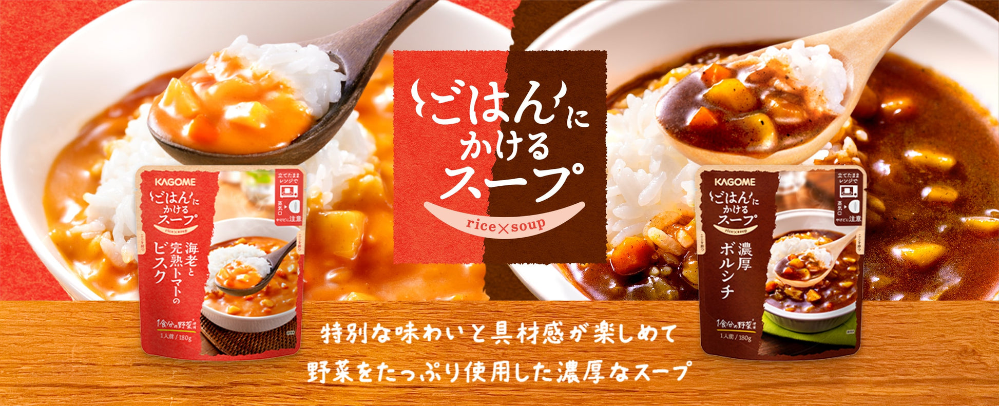 Kagome's "Soup to Pour Over Rice" is a rich soup made with plenty of vegetables that goes well with rice. Two new varieties, "Shrimp and Ripe Tomato Bisque" and "Rich Borscht," were released on August 27, 2024. Both are characterized by their rich flavors, condensed with the umami of milk, seafood, tomatoes, and beef, and go well with bread.