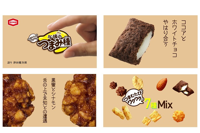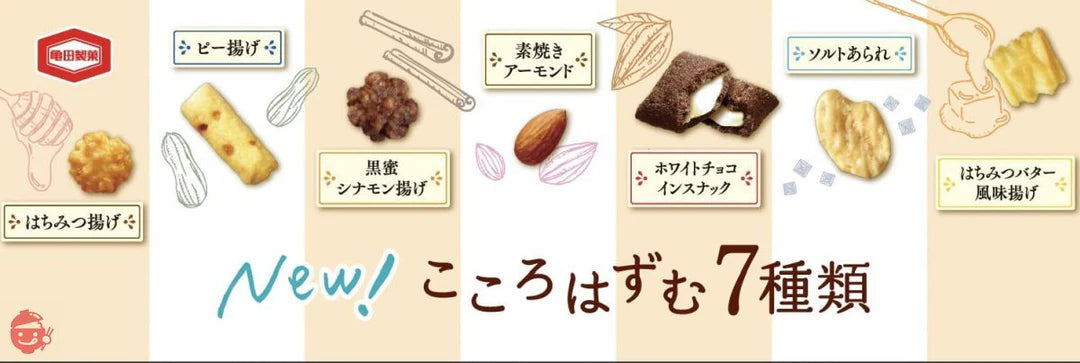 Contains seven flavors: "Baked Almonds," "Deep-Fried Brown Sugar and Cinnamon," "Deep-Fried Honey and Butter," "Deep-Fried Peas," "Deep-Fried Honey," "Cream Cocoa Snack," and "Salted Rice Crackers."