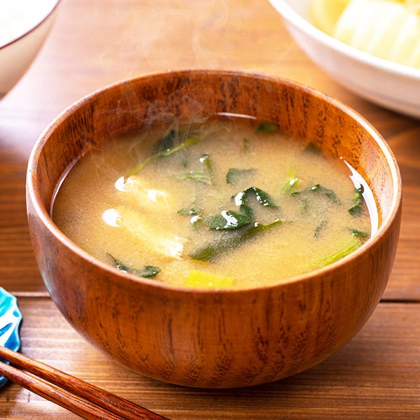 It contains 9 servings each of a matured blend of rice miso and soybean miso, plus the classic toppings of tofu, fried tofu, green onion, and wakame seaweed.