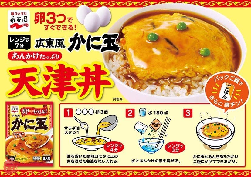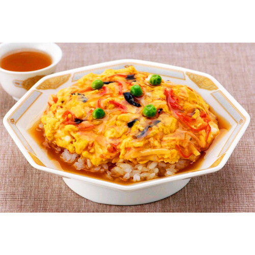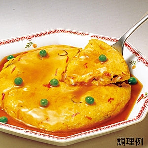 The "Crab Omelet Mix," which you mix with eggs and fry, contains bamboo shoots, carrots, crab meat, kamaboko, wood ear mushrooms, and shiitake mushrooms. The "Thick Sauce Mix" contains green peas. Both the crab omelet and the thick sauce can be made in one frying pan, so you can easily create crab omelets filled with ingredients and smothered in a rich sauce.
