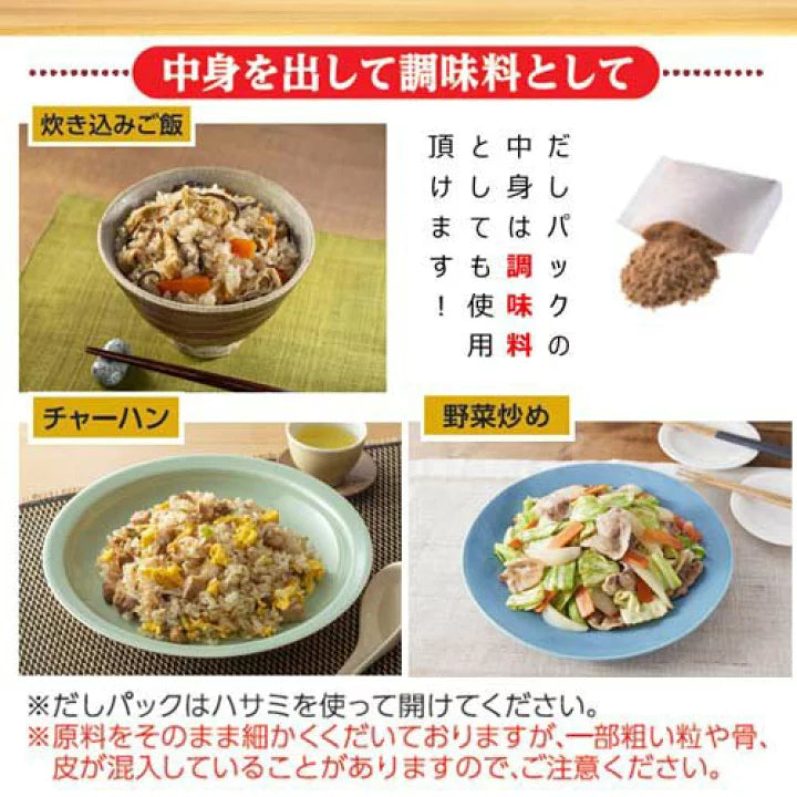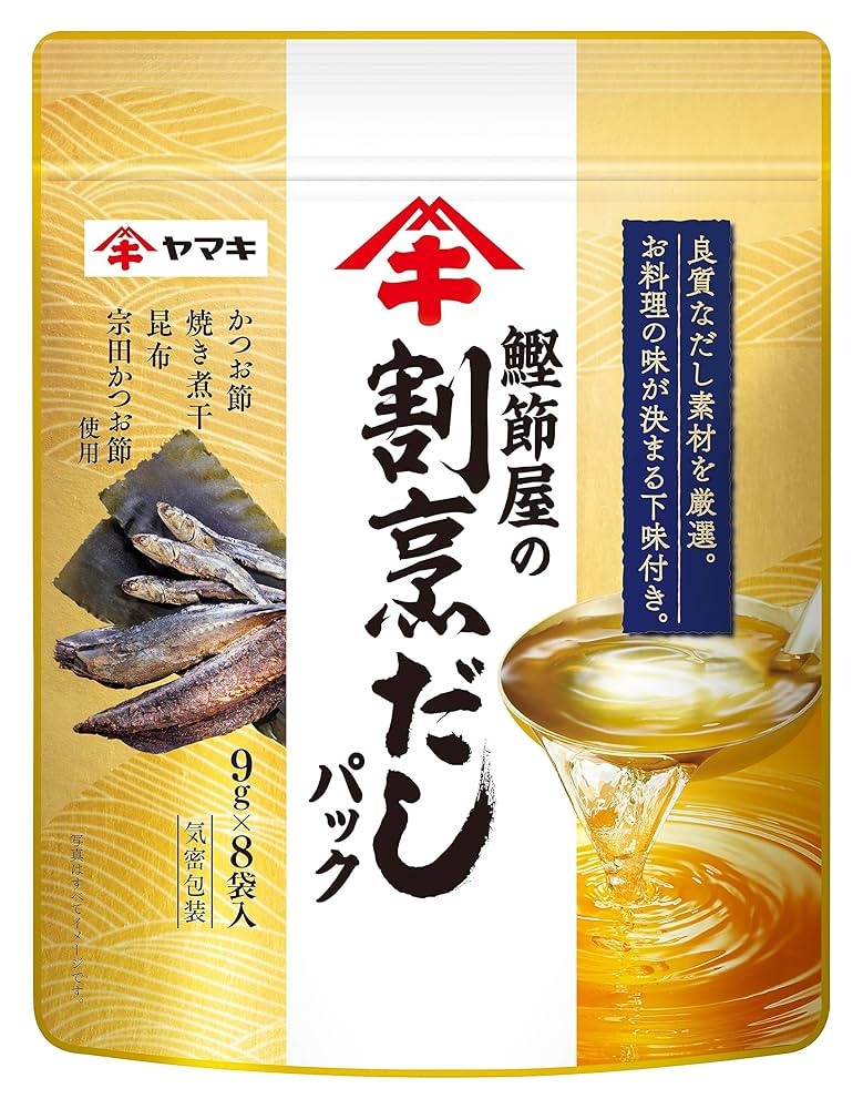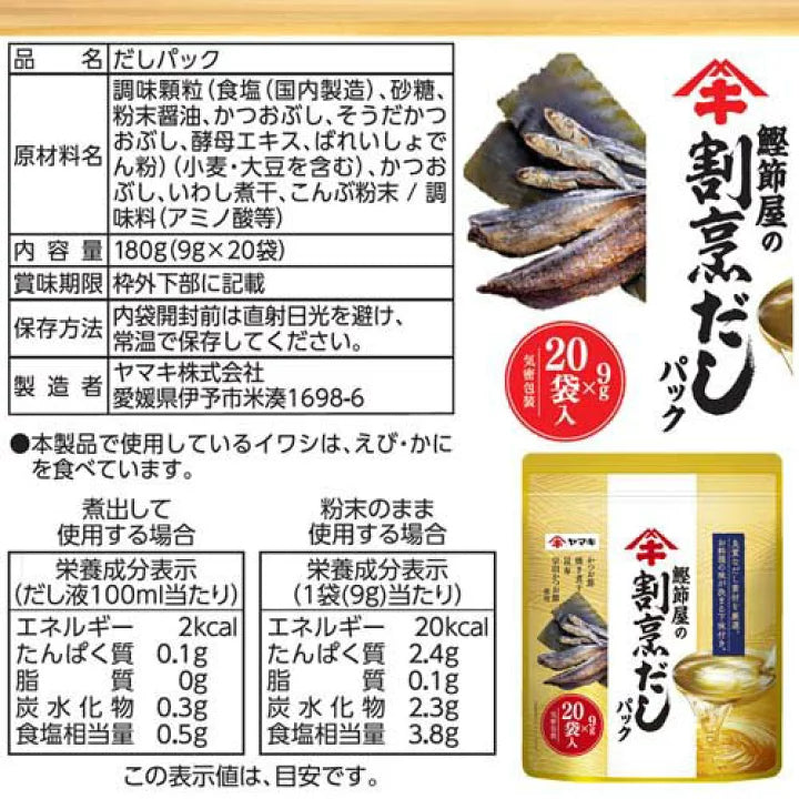 Yamaki, a bonito flakes manufacturer, has carefully selected high-quality dashi ingredients to create this dashi pack. It comes with a pre-seasoning that will add flavor to your dish. It uses bonito flakes, grilled sardines, kelp, and bonito flakes.